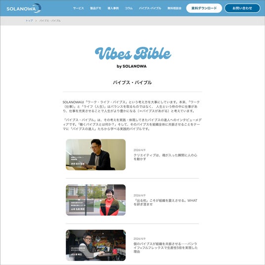 累計100万人以上に利用されているWeb社内報アプリ「SOLANOWA」を提供する株式会社フューチャースピリッツ(本社:京都市下京区、代表取締役:谷孝 大)は、社内広報担当者および経営者向けオウンドメディア『バイブス・バイブル』を2026年4月8日に公開しました。