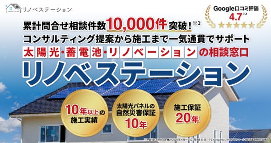 太陽光・蓄電池・リノベーション事業を展開する株式会社インフィニティエージェント(本社:東京都千代田区、代表取締役:岡田裕平)のDX事業部が運営する専門メディア「リノベステーション」を通じた問い合わせ相談件数が、累計10,000件(※1)を突破したことをお知らせいたします。また、Google口コミにおいても、件数100件を突破し、5段階評価で平均4.7以上(※2)の高い顧客満足度を獲得しています。