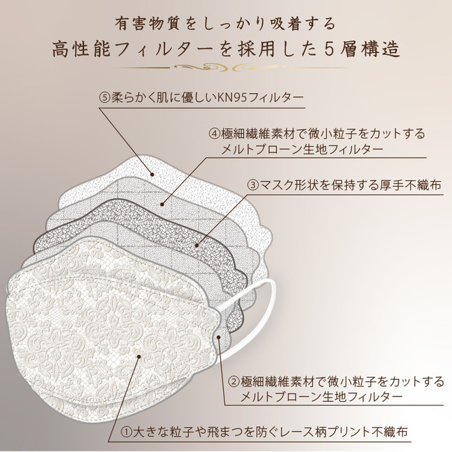 『マスクセレブDewi』は、5層構造フィルターで有害物質をしっかり吸着。第三者機関で行ったマスクのフィルター性能試験では、PFE・VFE・BFE・花粉全て99%カット(フィルター性能による)のエビデンスを取得しています。また、肌に接触する内側のフィルターには柔らかく肌に優しいKN95フィルターを使用することで、長時間の着用でも快適に過ごせます。