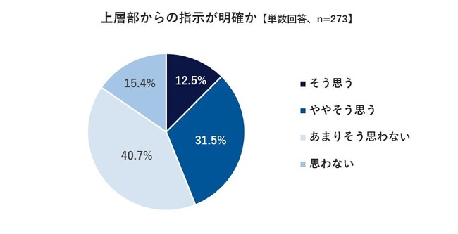 お勤めしている企業について、上層部からの指示が明確か聞いたところ、「そう思う」12.5%、「ややそう思う」31.5%、「あまりそう思わない」40.7%、「思わない」15.4%でした。「あまりそう思わない」「思わない」が56.1%と半数以上の方が上層部からの指示が明確でないことがわかりました。