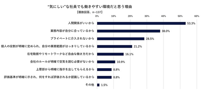 Q4. あなたがお勤めしている企業は“気にしい”な社員でも働きやすい環境だと思いますか。(単数回答、n=273)また、働きやすいと思う理由についてもお答えください。(複数回答、n=137)