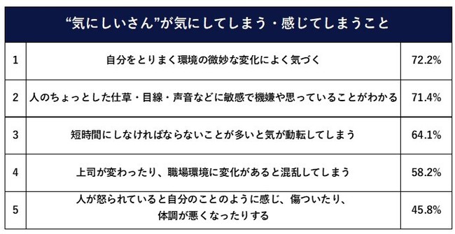 ご自身のことを“気にしい”であると回答した方へ、各項目についてお聞きしたところ、「あてはまる」「ややあてはまる」と回答した方が最も多い項目は、「自分をとりまく環境の微妙な変化によく気づく」72.2%となりました。次いで、「人のちょっとした仕草・目線・声音などに敏感で機嫌や思っていることがわかる」71.4%、「短時間にしなければならないことが多いと気が動転してしまう」64.1%と続きます。多くの“気にしいさん”の特徴として、環境の変化によく気づき、人の動作・機嫌がわかってしまうことが判明しました。