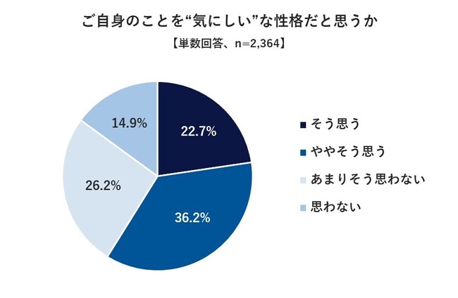本調査対象者を抽出する事前調査で会社員の方にご自身のことを“気にしい”な性格だと思うか聞いたところ、「そう思う」22.7%、「ややそう思う」36.2%、「あまりそう思わない」26.2%、「思わない」14.9%でした。「そう思う」「ややそう思う」の合計が58.8%で約6割もの方がご自身のことを“気にしい”だと思っていることが明らかになりました。