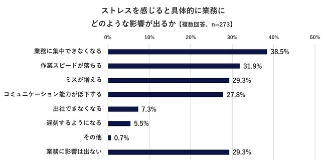 ストレスを感じると具体的に業務にどのような影響が出るか聞いたところ、最も多かった回答が「業務に集中できなくなる」38.5%で約4割の方が回答しています。次いで、「作業スピードが落ちる」31.9%、「ミスが増える」29.3%でした。Q1で約7割の方が「人のちょっとした仕草・目線・声音などに敏感で機嫌や思っていることがわかる」と回答していたことから、周りのことが気になり余計にストレスを感じてしまうため、業務に集中できなくなるのかもしれません。