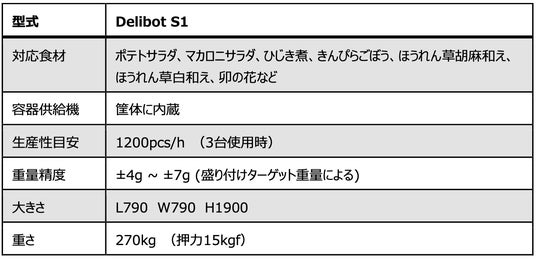 ■汎用型 惣菜盛付ロボット「Delibot S1」の主な仕様
