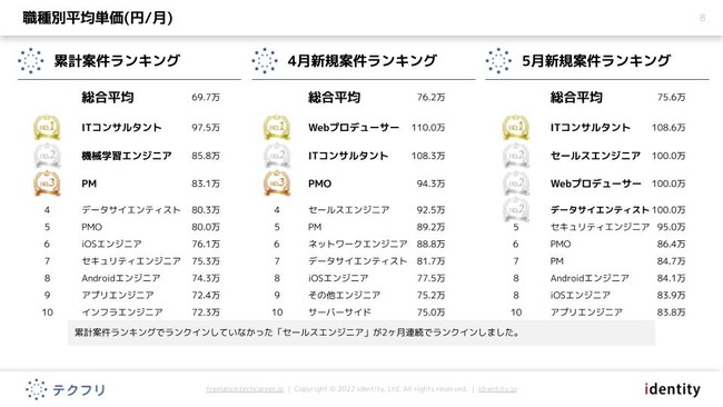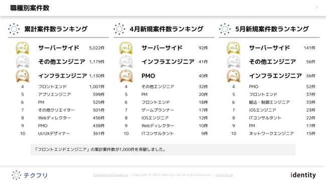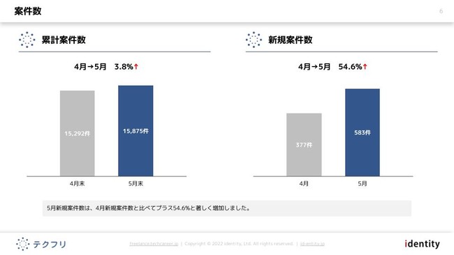 ITフリーランスエンジニアの案件・求人サイト「テクフリ」(https://freelance.techcareer.jp/)を運営する株式会社アイデンティティー(東京都新宿区、代表取締役:今野 力、以下「当社」)は、テクフリのデータベースを元に2022年5月における案件の市況感を調査しました。より詳しい結果については、お問い合わせから資料請求いただけます。