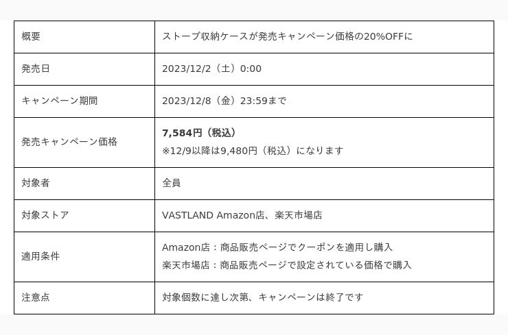 VASTLAND株式会社(本社:兵庫県姫路市/代表:田中悠貴)が運営するキャンプギアブランド「VASTLAND(ヴァストランド)」は、キャンプへの持ち出しや収納に便利な「ストーブ収納ケース」を2023/12/2(土)にAmazon店&楽天市場店で先行発売することを決定しました。また発売を記念して、Amazon店&楽天市場店限定で20%OFFの価格で購入できる「発売キャンペーン」を開催します。
