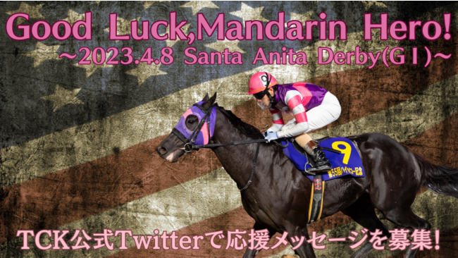 東京シティ競馬(TCK)では、大井競馬第20回開催(3/27~3/31)において、アメリカ・サンタアニタパーク競馬場で実施されるサンタアニタダービー(GI)(現地4月8日(土)・日本4月9日(日))への出走を目指すTCK所属のマンダリンヒーロー号(牡3・藤田 輝信きゅう舎)への応援メッセージを募集します。
