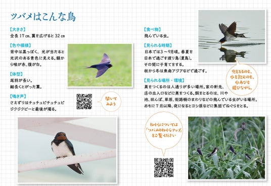 ツバメの基礎知識や観察の方法、観察時の注意点などを一枚のパンフレットにまとめました。また、ツバメの子育てのプロセスや見どころをイラストで解説しています。