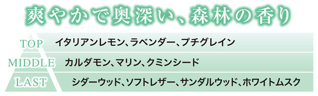 森林で深呼吸をしたような清涼感、ほのかに感じるスパイスや温もりのある香りが、男性のさりげない優しさと存在感を表現。誰にでも愛されながら自分の個性や意思も大切にする人のためのフレグランスとなっています。
