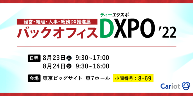 株式会社フレクト(本社:東京都港区、代表取締役CEO:黒川 幸治、以下フレクト)は、2022年8月23日(火)から24日(水)、東京ビッグサイト 東7ホールで開催される「バックオフィスDXPO 東京 '22」に、クルマと企業をつなぐドライバー働き方改革クラウド「Cariot(キャリオット、以下Cariot)」を出展しています。