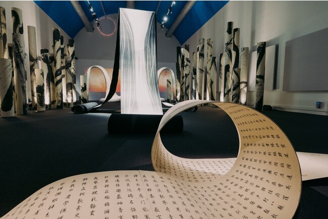 Zhang Chun Hong(張春紅:チャン・チュンホン)の作品「Fall」は、人間と自然の要素を巧みに組み合わせたハイブリッドを生み出しています。公比笔スタイルで細く描かれた、流れるような髪をモチーフに、鑑賞者が作品の中に入れる仕様の作品となっています。インスタレーションは、光と影、人体、自然界を通して進化し、流れる髪のラインを水の流れの表現へと変化させています。中国の伝統文化において、髪は生命と関連づいており、仏教思想に内在する時間性と連続性の観念を呼び起こしています。書道的な筆の線と中国の伝統的な山水画の原型的な質を組み合わせた滝は、ALCANTARA(R)を通じて、自然、身体、書が不可分になるビジョンとなっています。