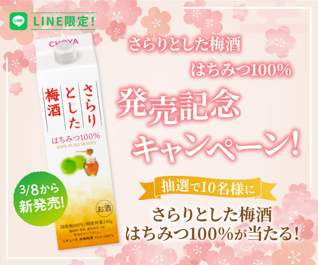 チョーヤ梅酒公式LINEアカウントでは、「さらりとした梅酒 はちみつ100%」の発売を記念し、プレゼントキャンペーンを実施します。
