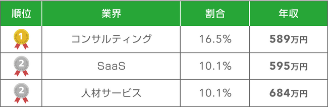 フリーランス営業の案件数は、コンサルティング業界が一番多い結果となりました。人材サービス業界は案件数3位かつ平均年収684万円と全体平均の652万円より高い結果となりました。