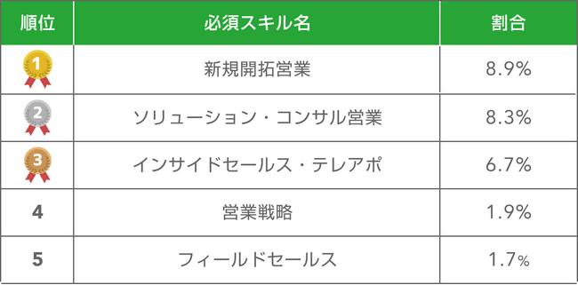 SOKUDAN(https://sokudan.work/)に掲載された営業の案件で、必須スキル項目に入力されたスキル名から上位5つを記載しております。