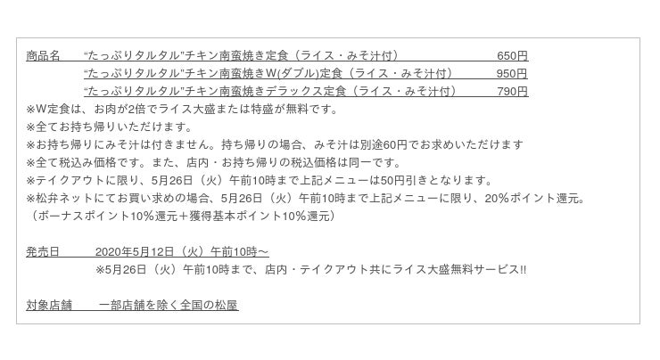 松屋の新作チキン南蛮ダレ×特製タルタルソースの相性抜群!テイクアウトなら50円引き!さらに松弁ネットなら20%ポイント還元 #おうちで松屋 ならお得に 2020年 5月 12日(火)午前10時より