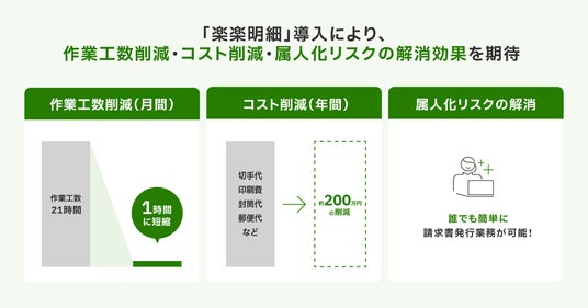 「楽楽明細」の導入により、経理担当であれば誰でも簡単に請求書発行業務を行える体制を構築することができます。属人化による作業ミスなどのリスクも解消される見込みです。
