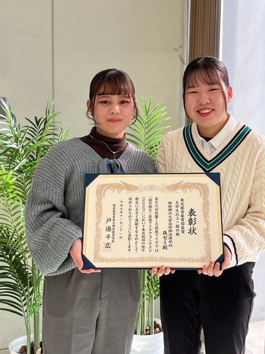 桐蔭横浜大学法学部4年の学生2名が、内閣府主催の「地方創生☆政策アイデアコンテスト2023」で、東北ブロックの優秀賞である「東北経済産業局長賞」を受賞しました。