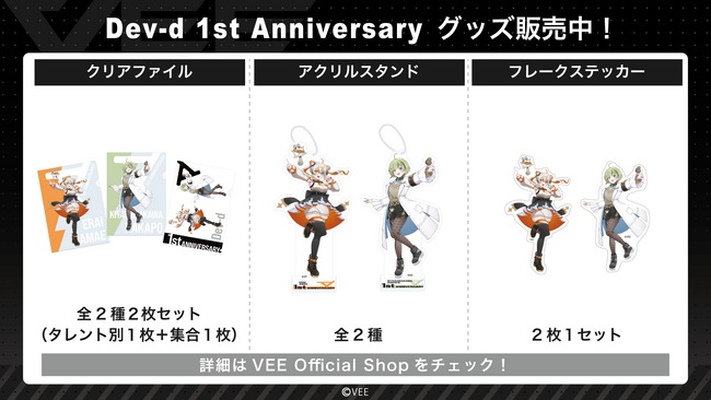 株式会社ソニー・ミュージックエンタテインメント(本社:東京都千代田区、代表取締役社長:村松 俊亮)は、バーチャルタレント育成&マネジメントプロジェクト「VEE」の公式オンラインショップ「VEE Official Shop」にて、所属バーチャルタレントのうちDev-dの2名の1st Anniversary グッズの販売を開始したことをお知らせします。