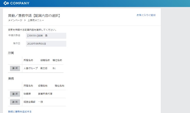 ▲現場部門からの異動申請も「COMPANY」で。承認された後は、手入力なく自動で人事情報へ登録。