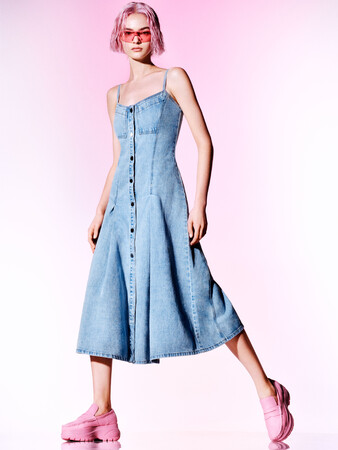 デニムはコレクションのキーポイントとなる素材のひとつです。ペールピンクのデニムは、スナップボタンをつけるとポンチョにもなる、マルチポジションのパンツとジャケットのアンサンブルです。また、ユニークなフォルムのシンプルなストラップドレス、ベルトを結んだり外したりして2種類のシルエットを楽しむことができるスーパーワイドレッグのパンツはスノーウォッシュデニムで作られています。このほか、ネックラインに目の錯覚を利用したドレス(リリース上部)、ダブルストラップのオリジナリティあふれるツートンカラーのドレス、ピンクとオレンジのコズミックスタイルのプリントを施したドレス3点も展開します。