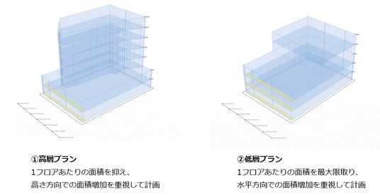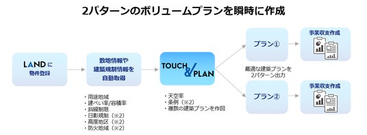 物件情報管理サービス「TASUKI TECH LAND」に物件情報を登録すると、敷地情報・建築規制情報を自動取得します。この情報をもとに、隣地境界条件や建物高さ設定を行い、「ボリュームチェック」ボタンをクリックするだけで、「TOUCH&PLAN」が、複数パターンの建築プランを瞬時に作成します。その中で、1フロアあたりの面積を抑え階数を積み上げる「高層プラン」と、1フロアあたりの面積を最大限拡げていく「低層プラン」の2パターンの結果表示をします。