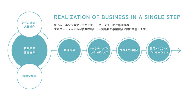 BizDev、エンジニア、デザイナー、マーケターなど各領域のプロフェッショナルが多数在籍し、一気通貫で事業共創を行なっています。