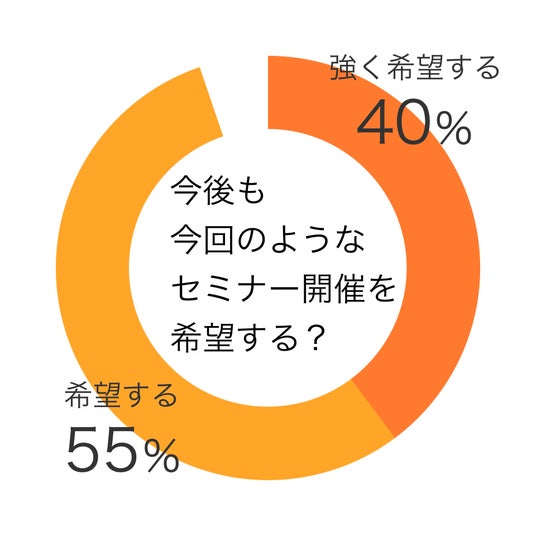質問「今後も今回のようなセミナー開催を希望する?」についての回答割合は、「強く希望する」40%、「希望する」55%となりました。希望する割合は9割以上となりました。ほとんどの参加者が同様のセミナーを受講したいと思っていることがわかりました。