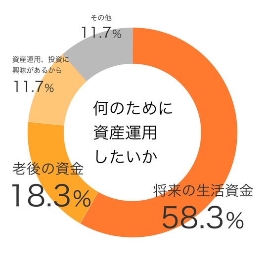 質問「何のために資産運用したいか」についての回答割合は、「将来の生活資金」58.3%、「老後の資金」18.3%となりました。7割以上の方が将来や老後に備えて資産運用を行いたいと考えていることがわかりました。