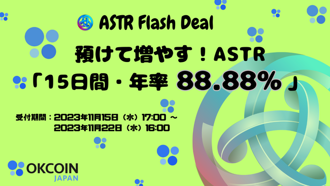 当社は、OKCoinJapan(暗号資産取引所)にて、アスター(ASTR)のステーキングサービス提供開始を記念し、「預けて増やす!15日間・年率88.88%」のFlash Deal(フラッシュディール)を開催いたします。