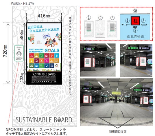 『TOKYO SUSTAINABLE BOARD』のモニターには、弊社独自ブランドのフルカラー式電子ペーパー『ミラパレ』を採用し、NFC(※1)機能を搭載した『ミラパレTOUCH!』も装備しています。今後、様々な企業・団体によるサステナブル活動の告知を予定しており、サステナブル活動発信の場として認知向上を図ってまいります。サステナブル活動専用メディアへのご出稿が、企業・団体の価値向上の一助となれば幸いです。正式な媒体化は2026年1月以降を予定しています。