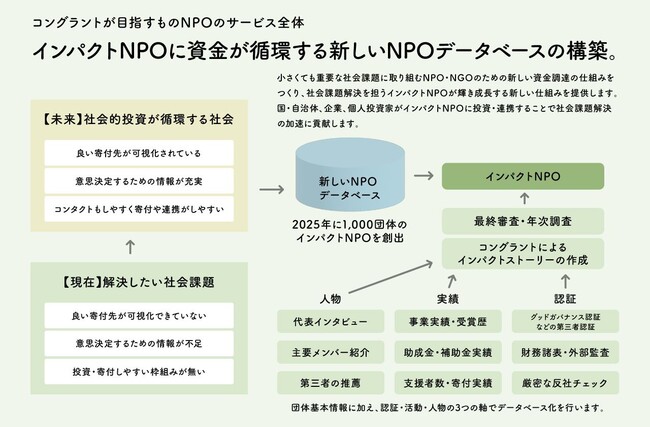 将来、このNPOデータベースが当たり前になった社会では、国・自治体、企業、個人投資家がインパクトNPOに寄付・連携することで様々なナレッジと浸透による社会課題解決が実現します。