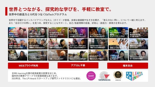 Inspire Highは、世界とつながる探究的な学びを手軽に教室で実践できるEdTechプログラムです。世界中の多様な大人の生き方や価値観、仕事、社会課題に触れる体験を通し、生徒の好奇心や主体性を育みます。また、生徒一人ひとりの「自分だけの問い」を引き出し、学びを深める授業を、手軽に負荷なく実現できます。