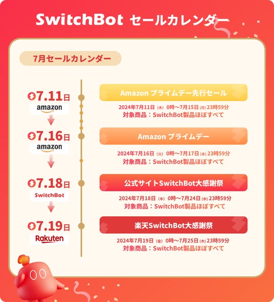 IoT・スマートホーム事業を手掛ける「IoTデバイスNo.1ブランド」(※2022年11月 家電Biz調べ)SWITCHBOT株式会社(本社 : 東京都渋谷区)は、このたび利用者総数が200万世帯を突破。ユーザーの皆さまへ感謝の気持ちを込めて、7月5日(金)~7月25日(木)の期間中、SwitchBot大感謝祭イベントを実施いたします。同イベントでは、公式サイトの感謝祭をはじめ、Amazonプライムデー、楽天感謝祭など、各販路※にてお得な割引キャンペーンを実施。また、SNSの豪華プレゼントが当たる抽選キャンペーンもぜひお見逃しなく。