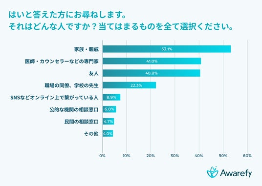 悩み相談の具体的な相手としては、家族(53.1%)が最も多く、ついで医師やカウンセラーなどの専門家(41.0%)、友人(40.8%)という結果でした。