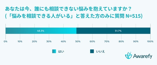 一方で、「悩みの相談先がある」と答えた人のうち、「あなたは今、誰にも相談できない悩みを抱えていますか?」という質問に対しては、48.3%の人が「はい」と回答しました。