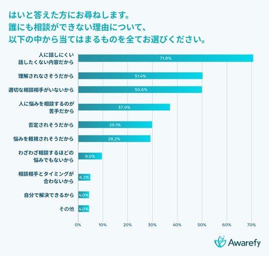 続いて、誰にも相談できない理由を尋ねたところ、「人に話しにくい・話したくないことだから」(71.8%)が最も多く、ついで「適切な相談相手がいないから」(50.6%)、「理解されなさそうだから」(51.4%)という理由が続きました。