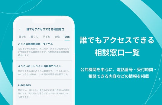 なお、自殺予防対策の一環として、アプリ内にはより適切な相談先につながることをサポートするために、支援先の相談窓口一覧を設置しています。