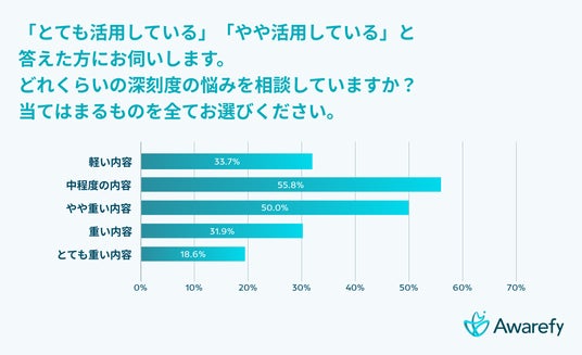 また、AIへの相談内容の深刻度を聞いたところ、中程度~やや重い内容の相談がボリュームゾーンを占め、軽い内容からとても重い内容までカバーしていることがわかります。