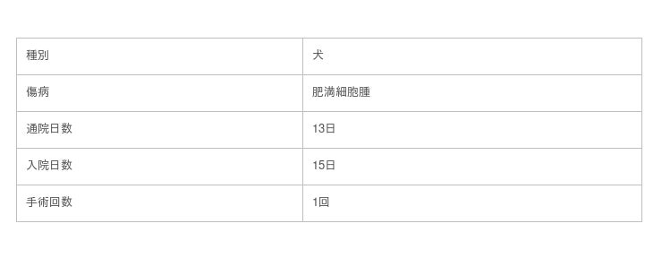 事例の犬の肥満細胞腫の通院日数、入院日数、手術回数について