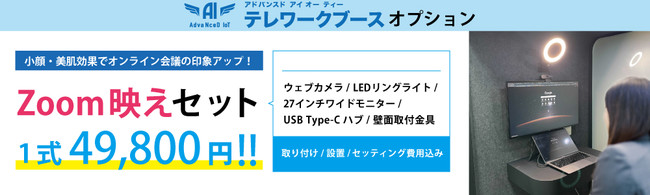 Web会議に最適な高い遮音性を持つ「AdvaNceD IoTテレワークブース」には、さらに快適にWeb会議に参加していただけるよう「Zoom映えセット」というオプションも用意してございます。27インチワイドモニターやLEDリングライトによって、顔色を明るく、表情や輪郭をきれいに映すので会議の相手に好印象を与えられます。