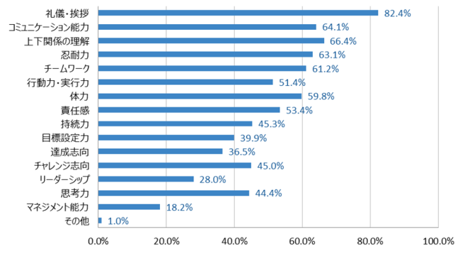 部活での経験を通して得た自身の強みは、「礼儀・挨拶(82.4%)」「上下関係の理解(66.4%)」「コミュニケーション能力(64.1%)」「忍耐力(63.1%」「チームワーク(61.2%)」が上位となった。運動部は競技成績を少しでも上を目指すという共通の目標に向かって、指導者や他学年、同級生など他者とのコミュニケーションをする場面が多く、かつ固定化されたコミュニティで活動をするため上述で挙げた能力が高いと推察される。 一方で、回答が少なかったのは「マネジメント能力(18.2%)」「リーダシップ(28.0%)」だった。【図1】