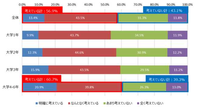 競技を辞めた後のキャリアについて、「考えている」と回答したのは56.9%で、「考えていない」と答えたのは43.1%だった。卒業が迫った大学4年生以降の学生においても、「考えていない」と回答した割合が39.3%に上った。【図5】