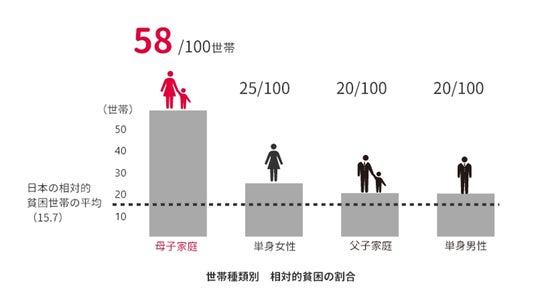 つまり日本人口の6人に1人、約2,000万人が貧困ライン以下での生活を余儀なくされているのです。特に母子家庭をめぐる状況は厳しく、約2世帯に1世帯が相対的貧困状態にあると言われています。