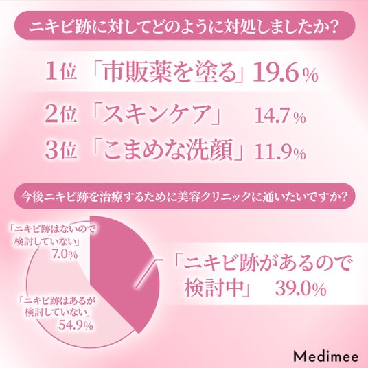 ニキビ跡に関する意識調査を行ったところ、9割以上の人がニキビ跡を経験したことがある一方で、市販薬やスキンケアなど自己流での対処を行っている人が多く、美容皮膚科で治療を行ったことがある人は少ないことが分かりました。