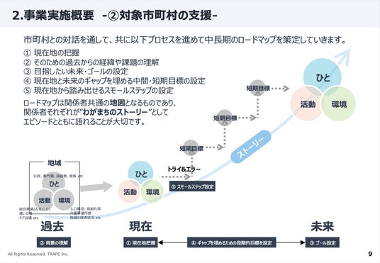 現状を把握し、ゴールを描き、そのギャップを埋める段階的な目標とスモールステップを設定。トライ&エラーを繰り返しながら、関係者全員が"わがまちのストーリー"として語れるロードマップを共に作り上げていきます。
