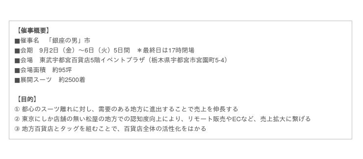 松屋銀座で半世紀以上続く名物催事「銀座の男」市が、初めて地方に出張して開催したのが今年の4月。第2弾となる今回は、東武宇都宮百貨店にて5日間開催いたします。働き方改革やコロナ禍における生活様式の変化から、都市部ではビジネスマンの必需品であったスーツの需要が減少する中、スーツ着用率の高い地方にコンテンツとして出向くことで、売上の確保と、地方に店舗の無い松屋の知名度向上を目指します。