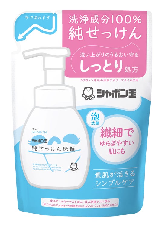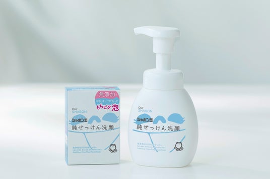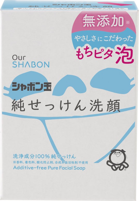 新ブランド「Our SHABON」から新しく発売される「純せっけん洗顔」(泡タイプ・固形タイプ)の洗浄成分は、香料・着色料・酸化防止剤・合成界面活性剤不使用の無添加石けんのみです。また、無添加ブランドとしてのこだわりはそのままに、洗い上がりのしっとり感はもちろん、洗い心地の良さを追求した「もちピタ泡※4」を実現し、肌本来の力を引き出す「洗いすぎない・与えすぎないスキンケア」を提案します。
