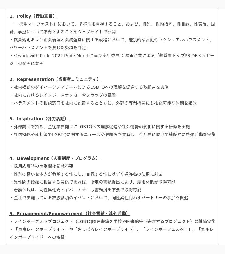 「PRIDE指標」は、企業等の枠組みを超えてLGBTQが働きやすい職場づくりを日本で実現することを目的に策定された指標であり、「Policy(行動宣言)」、「Representation(当事者コミュニティ)」、「Inspiration(啓発活動)」、「Development(人事制度・プログラム)」、「Engagement/Empowerment(社会貢献・渉外活動)」の5つの指標について評価が行われ、獲得点数によって「ゴールド」、「シルバー」、「ブロンズ」の表彰が行われるものです*2。