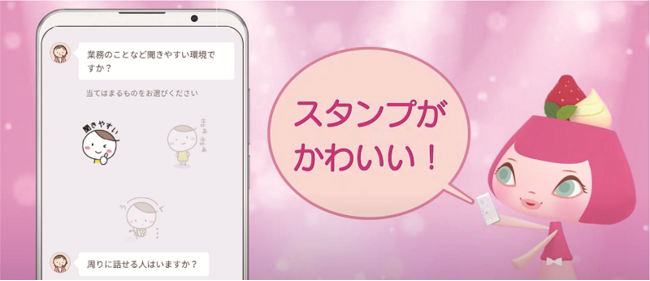 『SKD』は、派遣スタッフに就業状況を尋ねるメッセージを定期的に送信し、そのメッセージに「かわいいスタンプ」を使って返信するだけで営業担当者に自身の状況を簡単に伝えられる機能です。